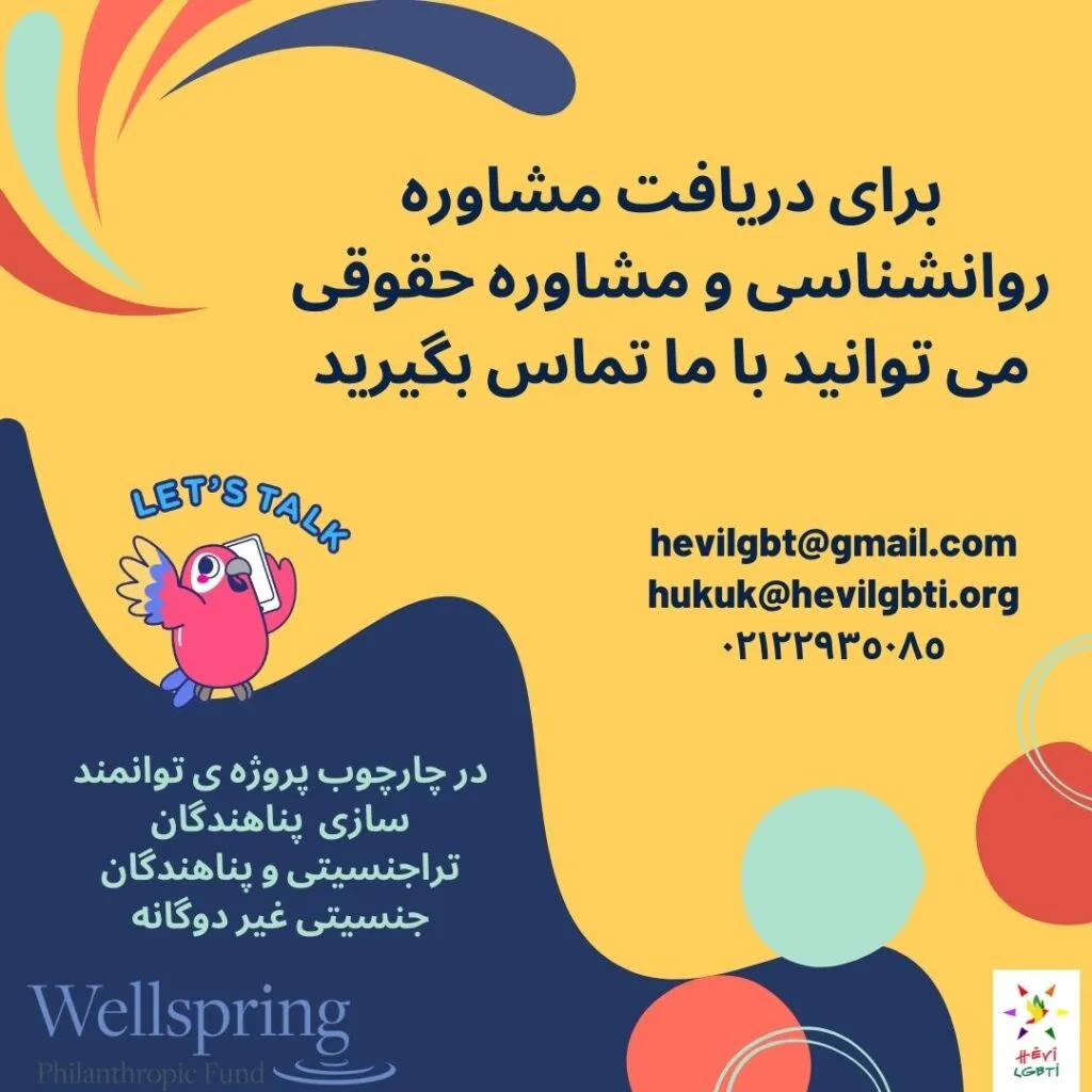 اگر فكر مى كنيد كه به مشاوره حقوقى و يا مشاوره روانشناسى نياز داريد، مى توانيد با شماره تلفن ٠٢١٢٢٩٣٥٠٨٥ هر روز هفته بين ساعات ١١ الى ١٨ و يا از طريق آدرس ايميل هاى hevilgbt@gmail.com و hukuk@hevilgbti.org با ما تماس بگيريد.